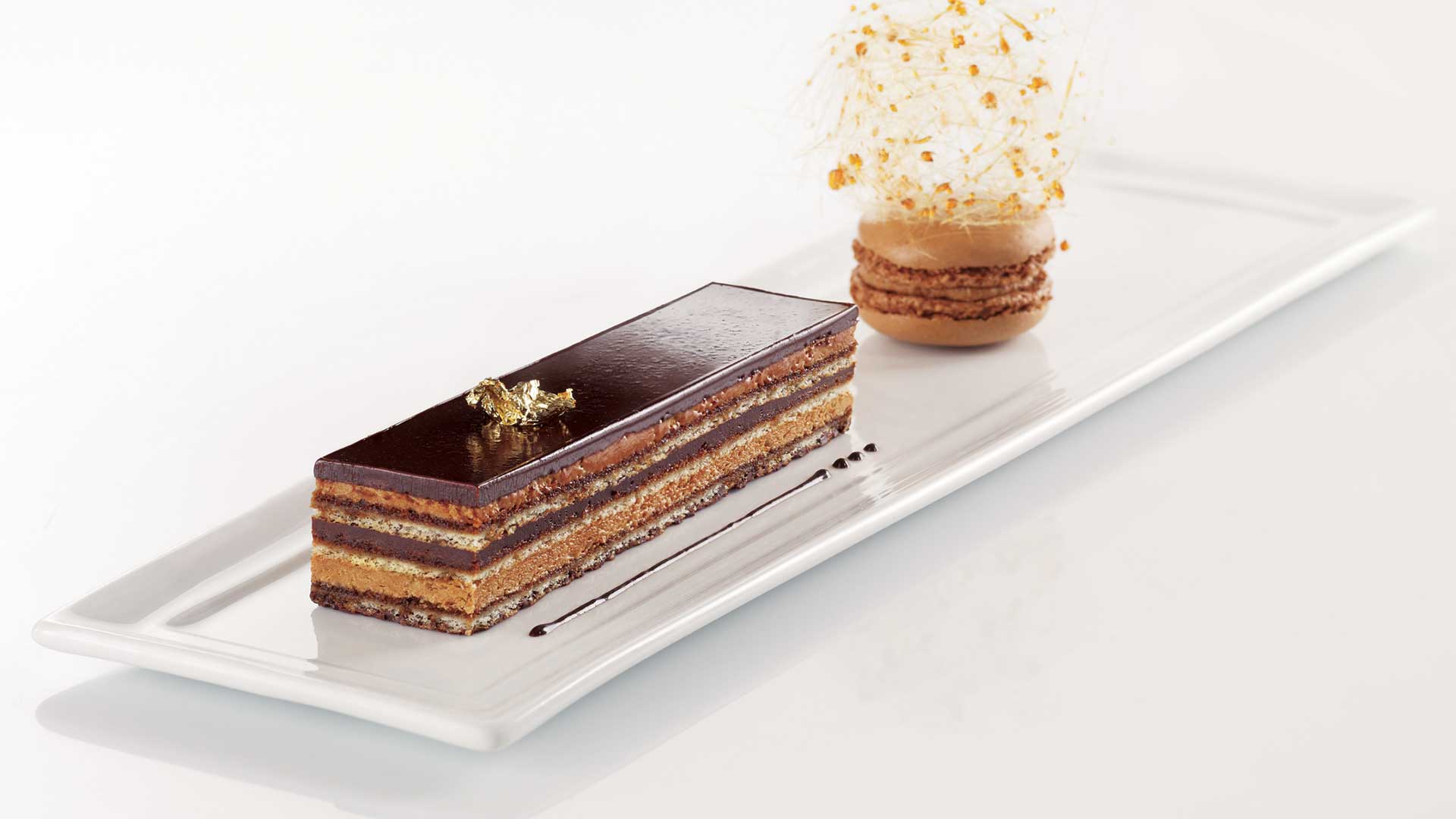 Saboroso e sofisticado, o bolo Opéra de Traiteur de Paris é constituído por uma camada de bolo Joconde, de uma delicada ganache de chocolate e de um ligeiro creme de manteiga perfumado com café, com uma cobertura de chocolate para dar o toque final.